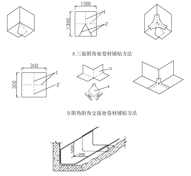 自粘防水卷材在施工的时候应注意一些细节问题,像一些边边角角的处理,最能看出施工队伍的技术和太态度问题。一般细节部分会附加处理,在铺设大面自粘防水卷材之前,应先在阴阳角等边角部位做好附加防水层。 阴阳角处的基层涂胶后要用密封膏涂封距角100mm,再铺一层自粘防水卷材附加层,自粘防水卷材如下图展示的,铺贴后剪缝处用密封膏封固。工程做完后不得有渗漏。